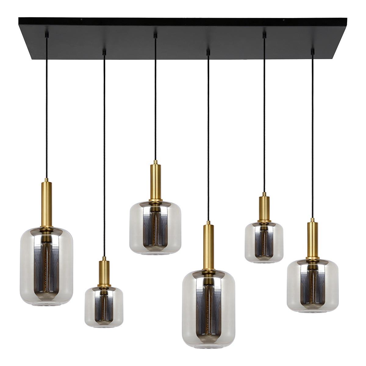 Подвесной светильник Lucide Joanet 45494/06/65 от Китайского бренда Lucide из коллекции Joanet предназначен для установки на потолок в кухне в стиле модерн. Cветильник в форме овала с металлической арматурой залотого цвета и дымчатого цвета плафонами из стекла предназначен для освещения 13 м2.