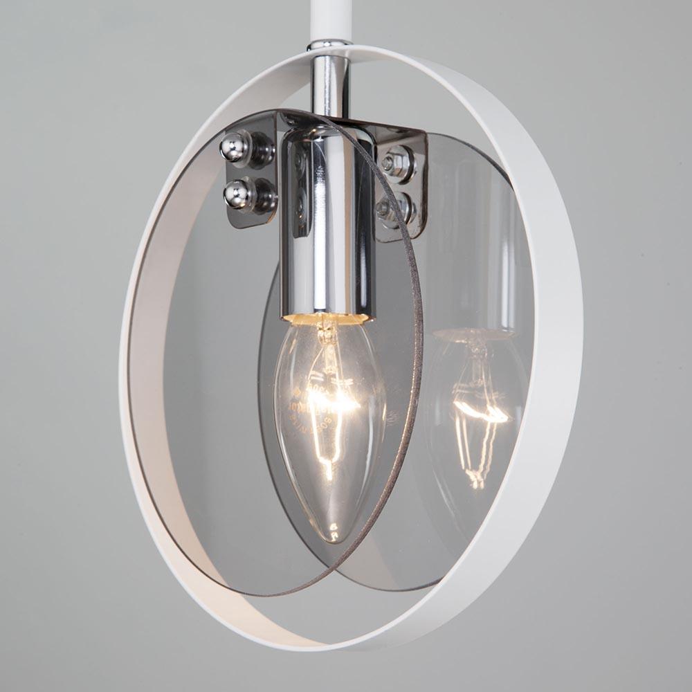 Подвесной светильник Eurosvet Gallo 50121/1 белый от Китайского бренда Eurosvet из коллекции Gallo предназначен для установки на потолок в спальни в современном стиле. Cветильник в форме круга с металлической арматурой белого цвета и дымчатого цвета плафонами из стекла предназначен для освещения 3 м2.