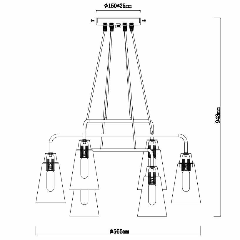 Для светильника необходима 6 ламп накаливания 40 W. Габариты изделия: высота – 948 мм, диаметр – 565 мм.