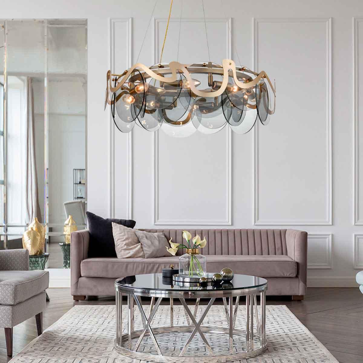 Подвесной светильник Vele Luce Melodia VL3294P08 от бренда из коллекции Melodia 1280 предназначен для установки на потолок в классиком стиле. Cветильник в форме с металлической арматурой цвета шампунт и дымчатого цвета плафонами из стекла предназначен для освещения 17,8 м2.