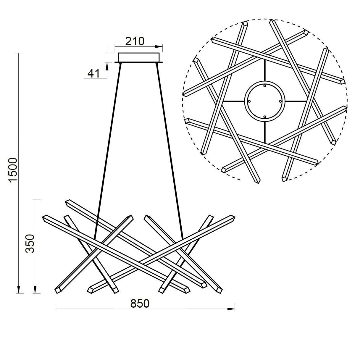 Для светильника необходима 1 светодиодная лампа 100 W. Габариты изделия: высота – 1500 мм, диаметр – 850 мм.