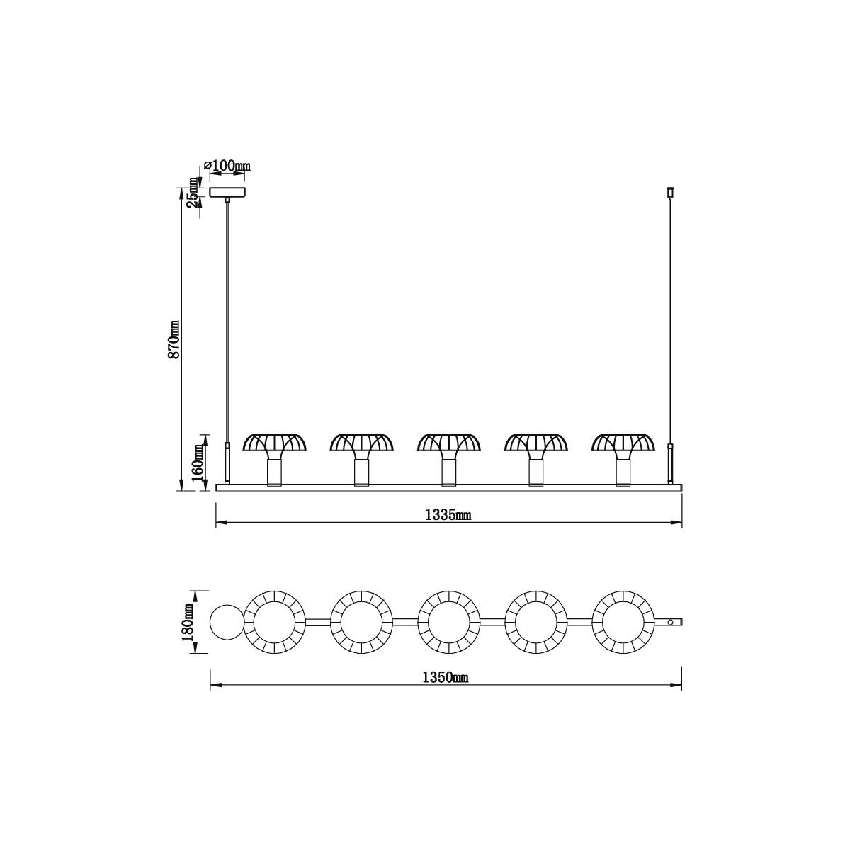 Для светильника необходима 5 ламп накаливания 40 W. Габариты изделия: высота – 870 мм, диаметр – мм.