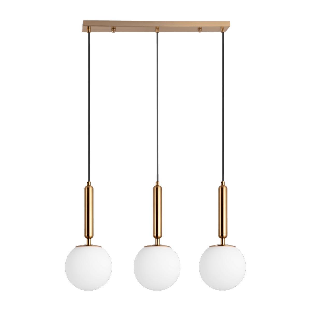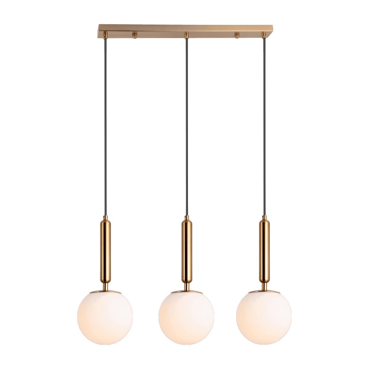 Подвесной светильник Moderli Scrumbel V6040-3P от Китайского бренда из коллекции Scrumbel предназначен для установки на потолок в кухне в современном стиле. Cветильник в форме с металлической арматурой залотого цвета и белого цвета плафонами из стекла предназначен для освещения 14 м2.