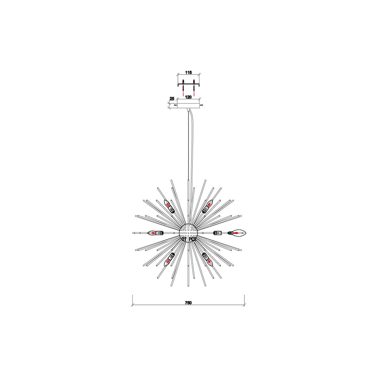 Для светильника необходима 14 ламп накаливания 40 W. Габариты изделия: высота – 1500 мм, диаметр – 750 мм.