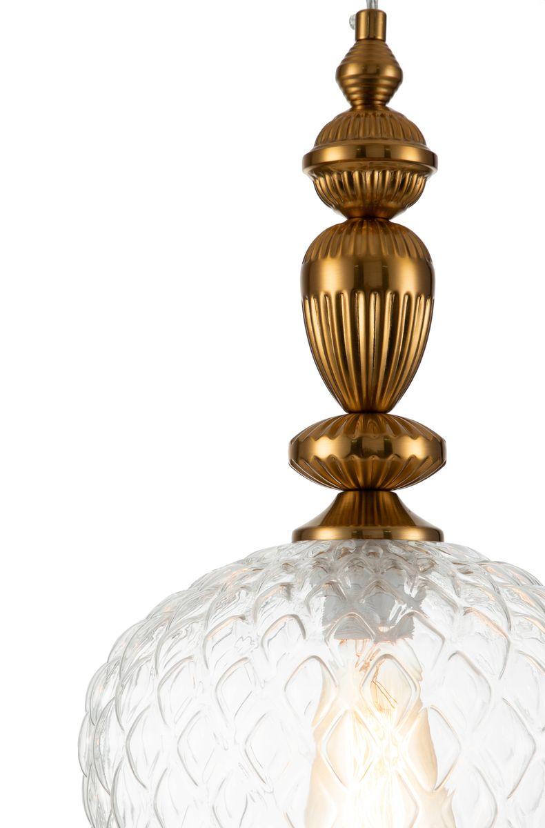 Подвесной светильник Indigo Annata 11010/1P Clear V000127 от Китайского бренда из коллекции Annata предназначен для установки на потолок в кухне в классиком стиле. Cветильник в форме с металлической арматурой цвета латуни и прозрачного цвета плафонами из стекла предназначен для освещения 3 м2.