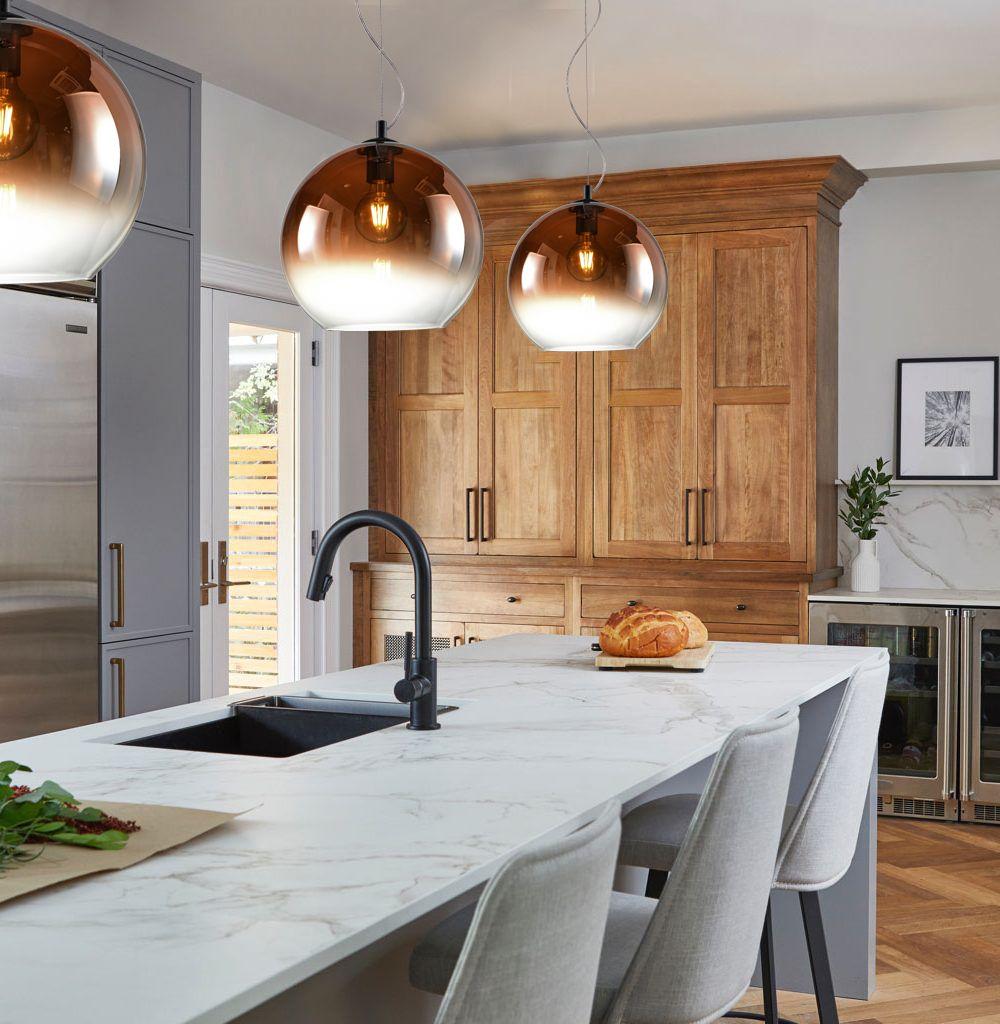 Подвесной светильник Milosh Tendence 0778PLB-1PG от Китайского бренда из коллекции 0778 предназначен для установки на потолок в кухне в скандинавском стиле. Cветильник в форме с металлической арматурой черного цвета и цвета меди плафонами из стекла предназначен для освещения 3 м2.