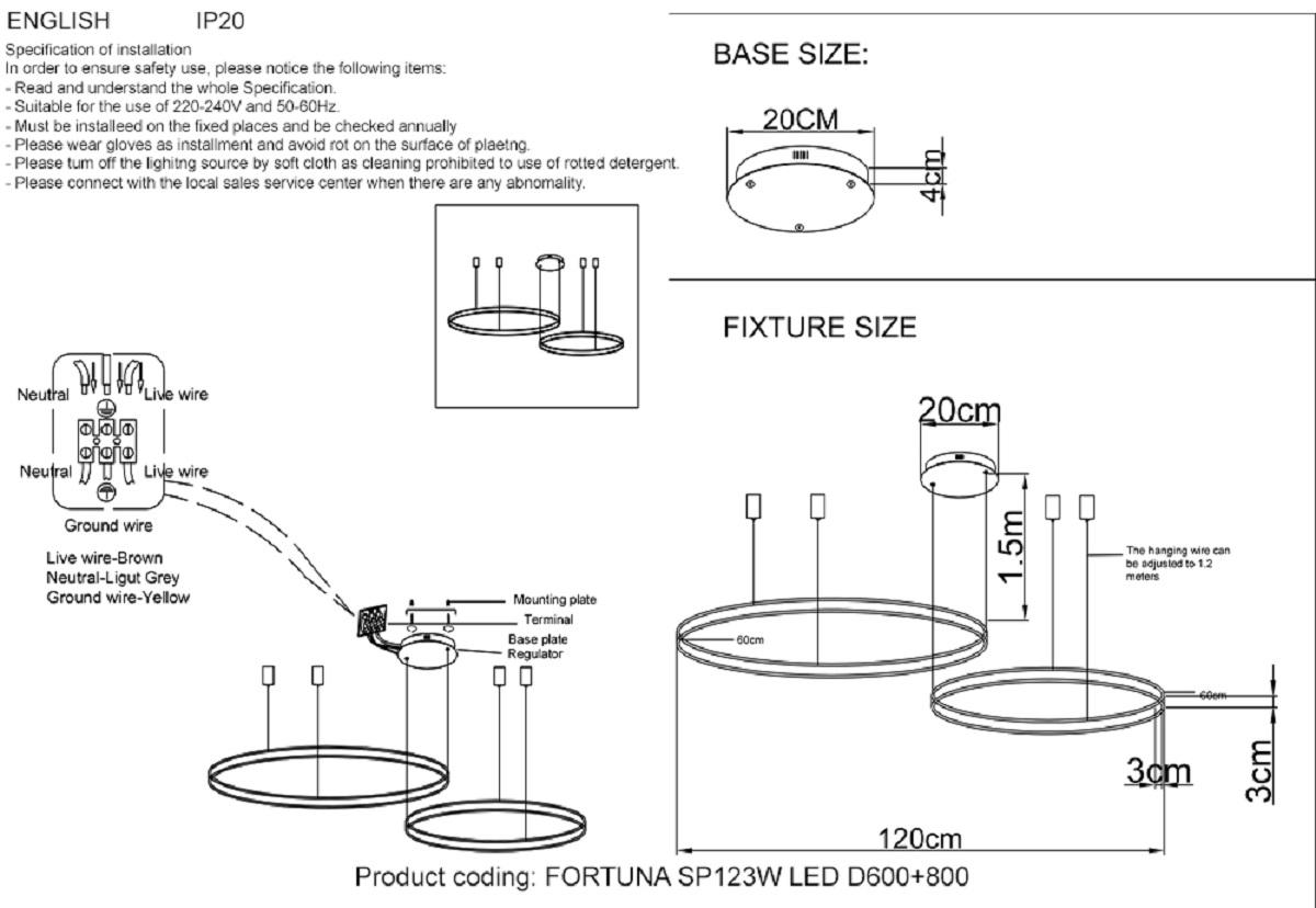Для светильника необходима светодиодных ламп 123 W. Габариты изделия: высота – 30 мм, диаметр – 1200 мм.