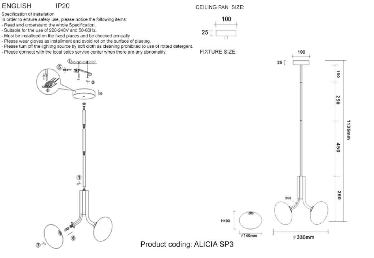 Для светильника необходима 3 светодиодные лампы 9 W. Габариты изделия: высота – 285 мм, диаметр – 330 мм.