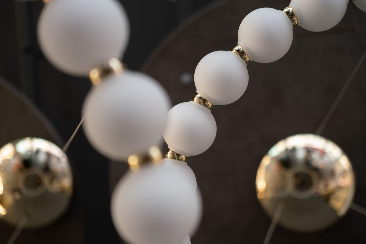 Подвесной светодиодный светильник Milosh Tendence 0851CL-81GD от Китайского бренда из коллекции 0851 предназначен для установки на потолок в спальни в стиле модерн. Cветильник в форме с металлической арматурой и белого цвета плафонами из стекла предназначен для освещения 20 м2.