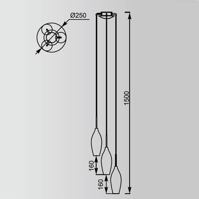 Для светильника необходима 3 лампы накаливания 40 W. Габариты изделия: высота – 1500 мм, диаметр – 250 мм.