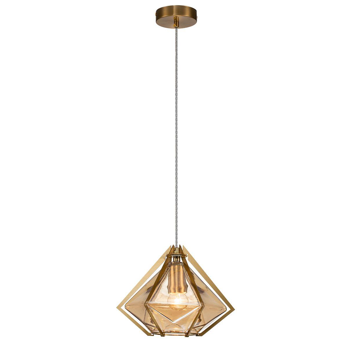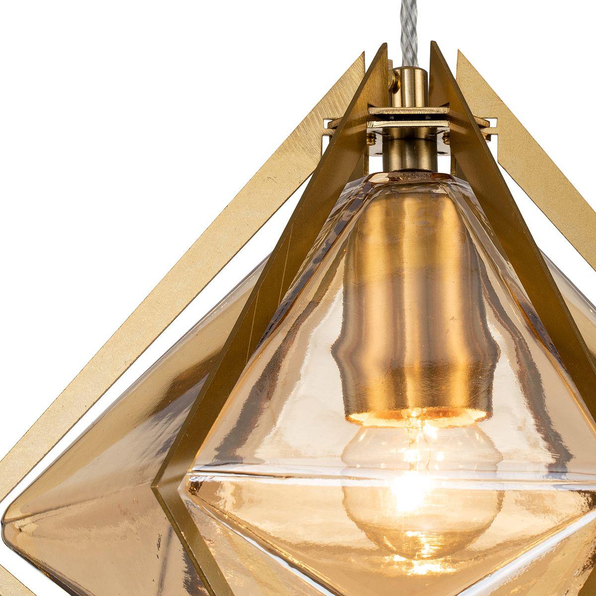 Подвесной светильник Indigo Vista 11012/B/1P Amber V000320 от бренда из коллекции Vista предназначен для установки на потолок в гостиной в скандинавском стиле. Cветильник в форме с металлической арматурой залотого цвета и янтарного цвета плафонами из стекла предназначен для освещения 3 м2.