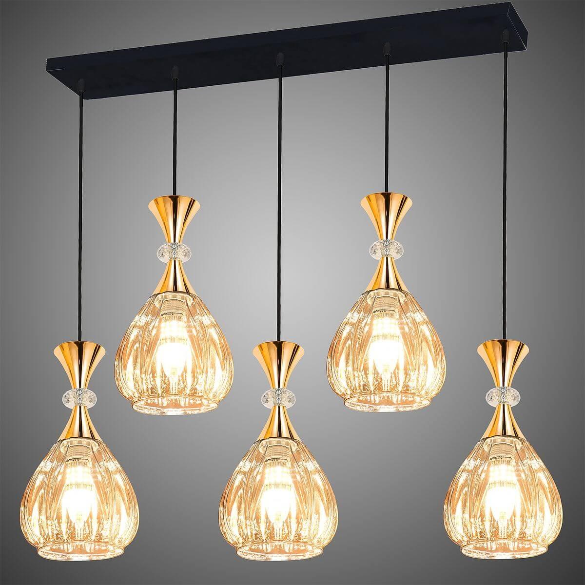 Подвесной светильник Reluce 09015-0.9-05L Amber от Китайского бренда из коллекции 09015 предназначен для установки на потолок в кухне в ретро стиле. Cветильник в форме с металлической арматурой и коричневого цвета плафонами из стекла предназначен для освещения 30 м2.