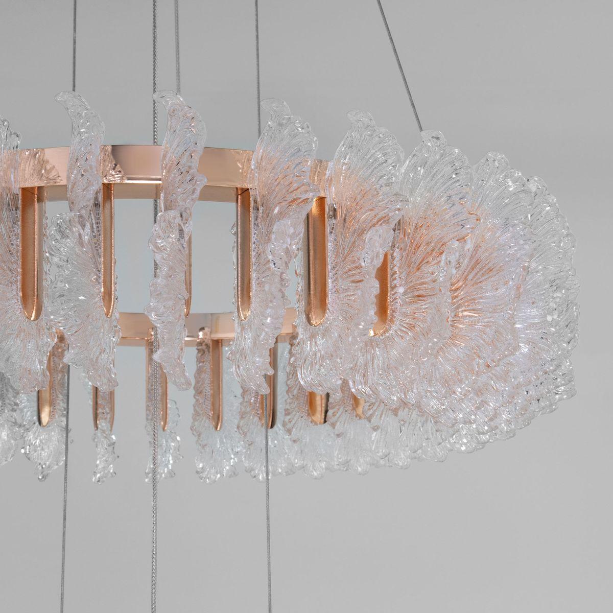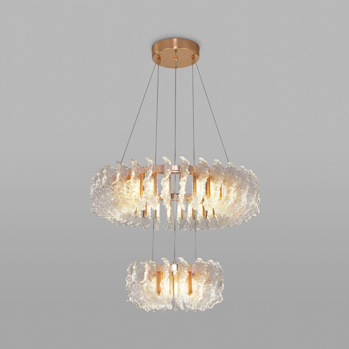 Подвесной светодиодный светильник Bogates Farfalla 90374/2 от Китайского бренда из коллекции Farfalla предназначен для установки на потолок в гостиной в стиле Арт-деко. Cветильник в форме с металлической арматурой залотого цвета и плафонами из предназначен для освещения 11 м2.