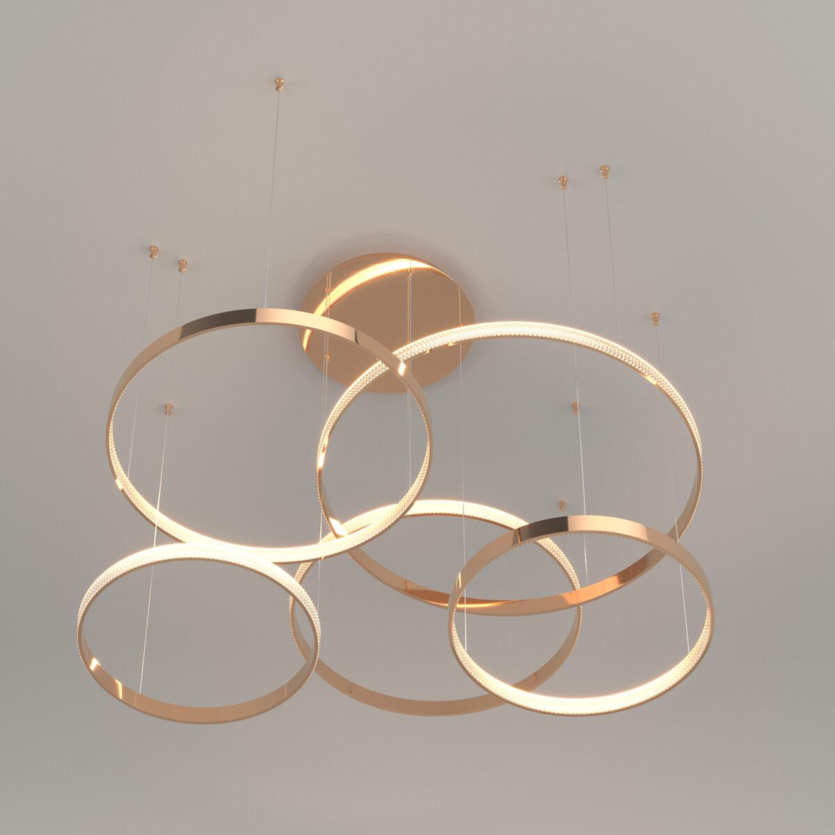 Подвесной светодиодный светильник Eurosvet Smart Posh 90275/5 медный от Китайского бренда из коллекции Smart Posh предназначен для установки на потолок в гостиной в стиле модерн. Cветильник в форме с металлической арматурой цвета меди и цвета меди плафонами из металла предназначен для освещения м2.