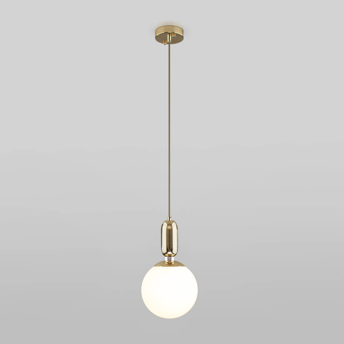 Подвесной светильник Eurosvet Bubble 50197/1 золото от Китайского бренда из коллекции Bubble предназначен для установки на потолок в кухне в скандинавском стиле. Cветильник в форме с металлической арматурой залотого цвета и белого цвета плафонами из стекла предназначен для освещения 3 м2.