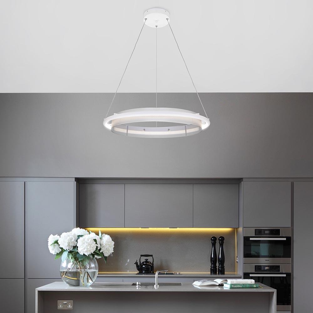 Подвесной светодиодный светильник Eurosvet Imperio 90241/1 белый/ серебро Smart от Китайского бренда из коллекции Imperio предназначен для установки на потолок в гостиной в хай-тек стиле. Cветильник в форме с металлической арматурой серебрянного цвета и белого цвета плафонами из пластика предназначен для освещения м2.