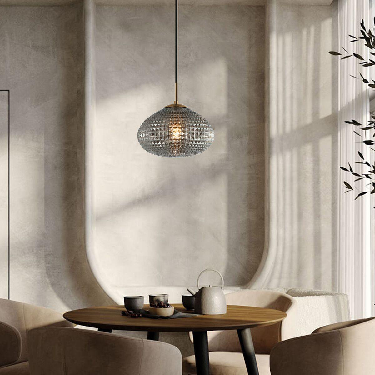 Подвесной светильник Eurosvet Gem 50263/1 серый от Китайского бренда из коллекции Gem предназначен для установки на потолок в кухне в ретро стиле. Cветильник в форме с металлической арматурой и серого цвета плафонами из стекла предназначен для освещения 2 м2.