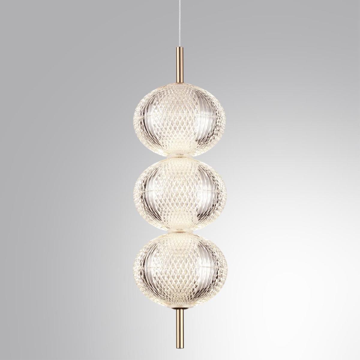 Подвесной светодиодный светильник Lumion Ledio Caprice 6577/18L от Китайского бренда из коллекции Caprice предназначен для установки на потолок в спальни в стиле модерн. Cветильник в форме с металлической арматурой залотого цвета и прозрачного цвета плафонами из пластика предназначен для освещения 4 м2.