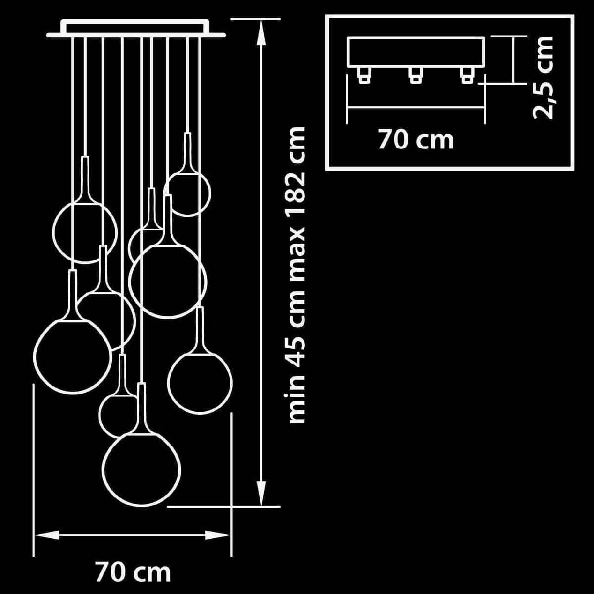 Для светильника необходима 9 ламп накаливания 40 W. Габариты изделия: высота – 450 мм, диаметр – 700 мм.