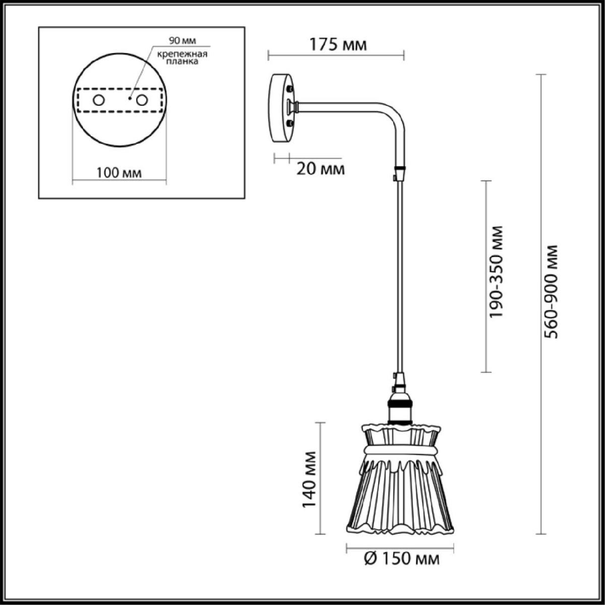 Для светильника необходима 1 лампа накаливания 40 W. Габариты изделия: высота – 1100 мм, диаметр – 120 мм.