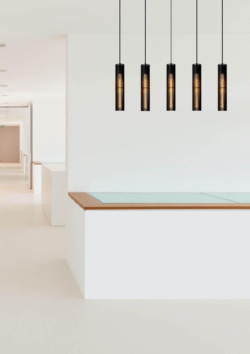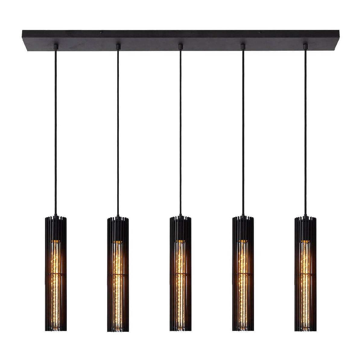 Подвесной светильник Lucide Lionel 73406/05/30 от Китайского бренда Lucide из коллекции Lionel предназначен для установки на потолок в кухне в лофт стиле. Cветильник в форме цилиндра с металлической арматурой черного цвета и черного цвета плафонами из металла предназначен для освещения 11 м2.