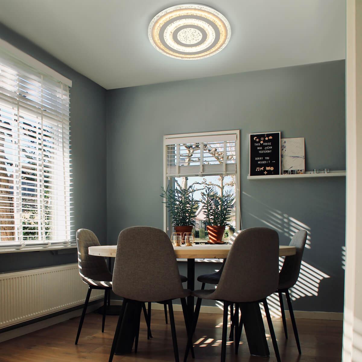 Для светильника необходима светодиодных ламп 170 W. Габариты изделия: высота – 50 мм, диаметр – 500 мм.