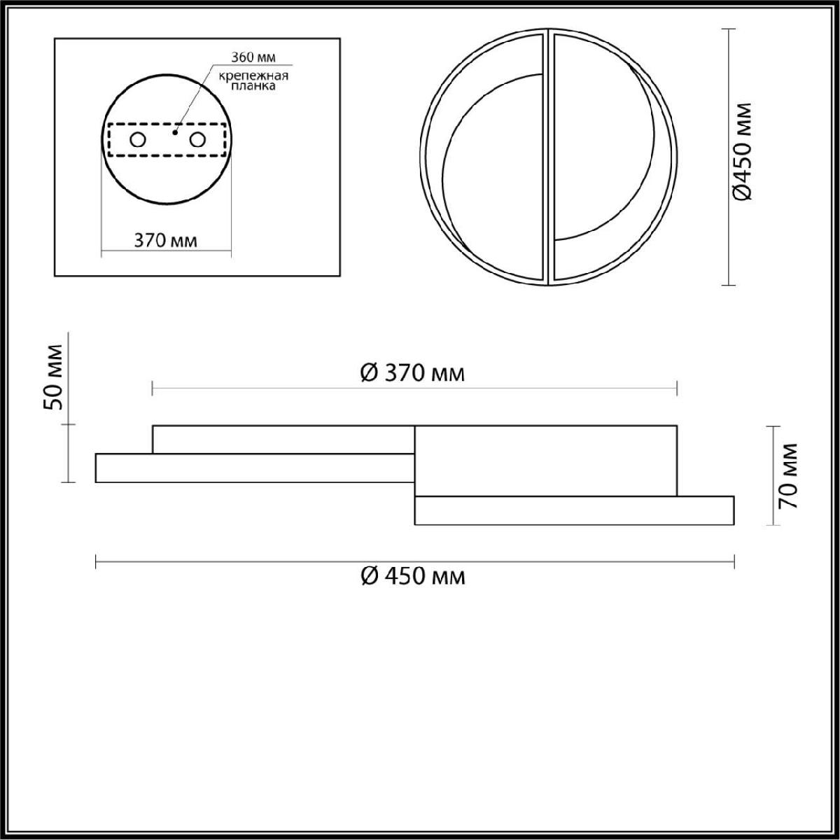 Для светильника необходима 2 светодиодные лампы 64 W. Габариты изделия: высота – 70 мм, диаметр – 450 мм.