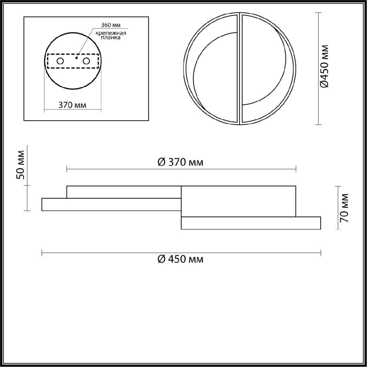 Для светильника необходима 2 светодиодные лампы 64 W. Габариты изделия: высота – 70 мм, диаметр – 450 мм.