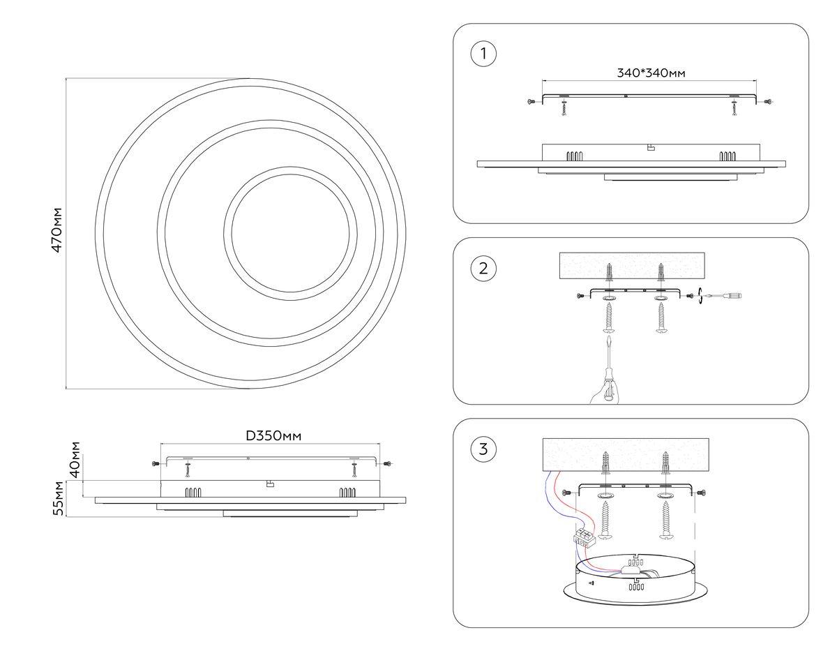 Для светильника необходима светодиодных ламп 62 W. Габариты изделия: высота – 55 мм, диаметр – 470 мм.