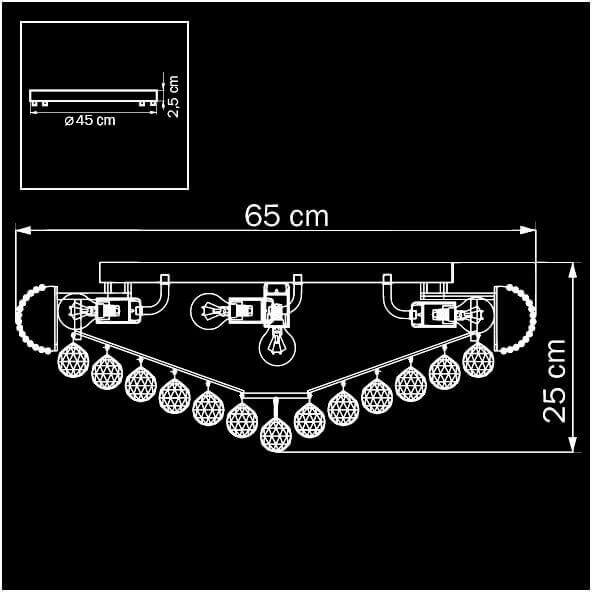 Для светильника необходима 17 ламп накаливания 40 W. Габариты изделия: высота – 240 мм, диаметр – 650 мм.