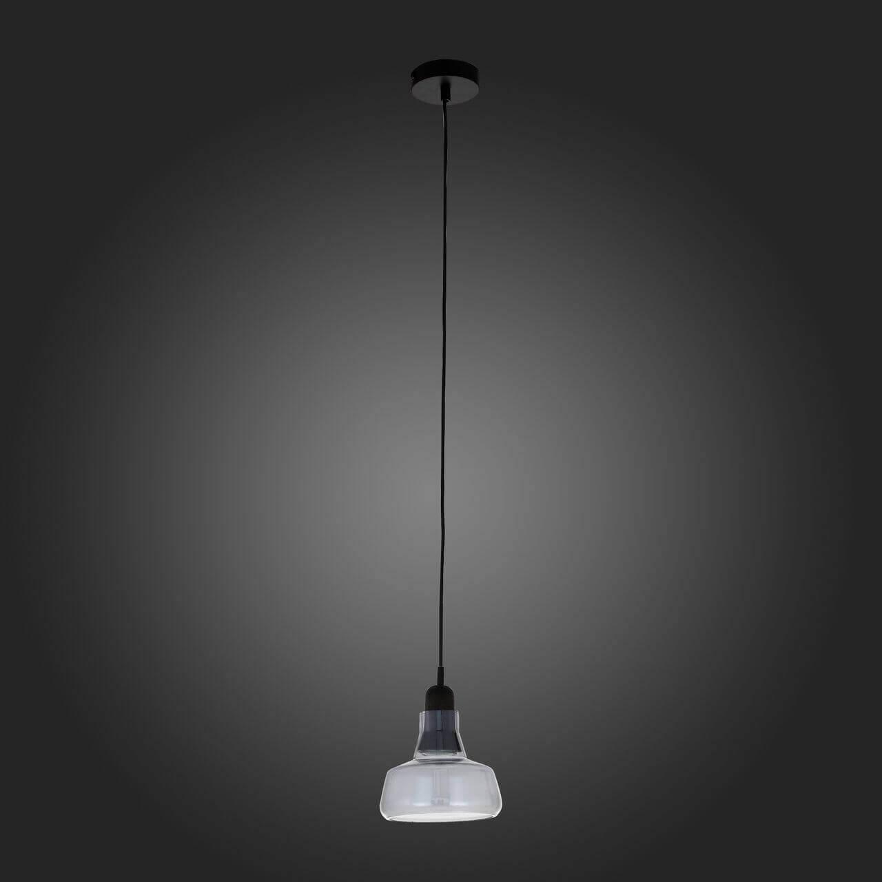 Подвесной светильник ST Luce Fumosi SL332.113.01 от Итальянского бренда ST Luce из коллекции Fumosi предназначен для установки на потолок в кухне в ретро стиле. Cветильник в форме конуса с металлической арматурой черного цвета и голобого цвета плафонами из стекла предназначен для освещения 3 м2.