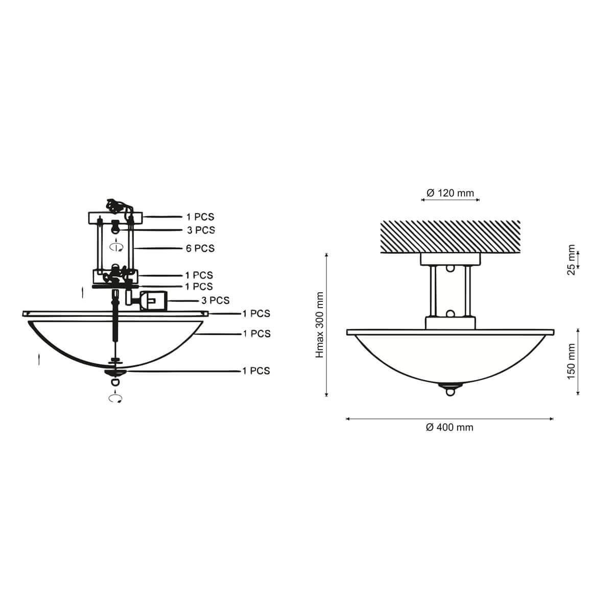 Для светильника необходима 3 лампы накаливания 60 W. Габариты изделия: высота – 250 мм, диаметр – 400 мм.
