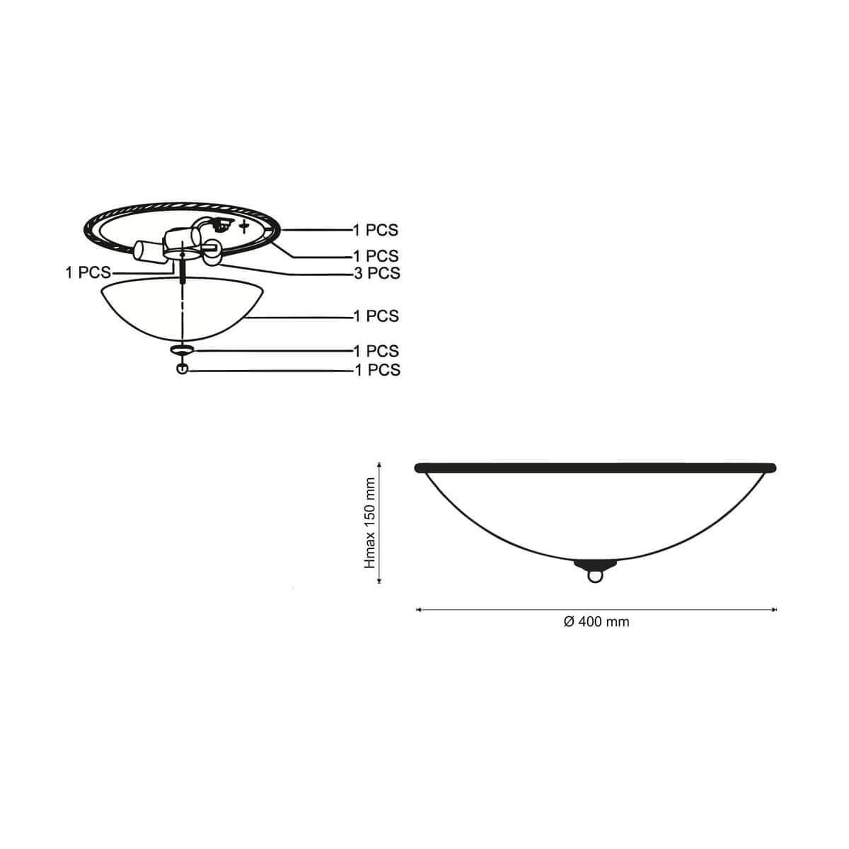 Для светильника необходима 3 лампы накаливания 60 W. Габариты изделия: высота – 200 мм, диаметр – 400 мм.