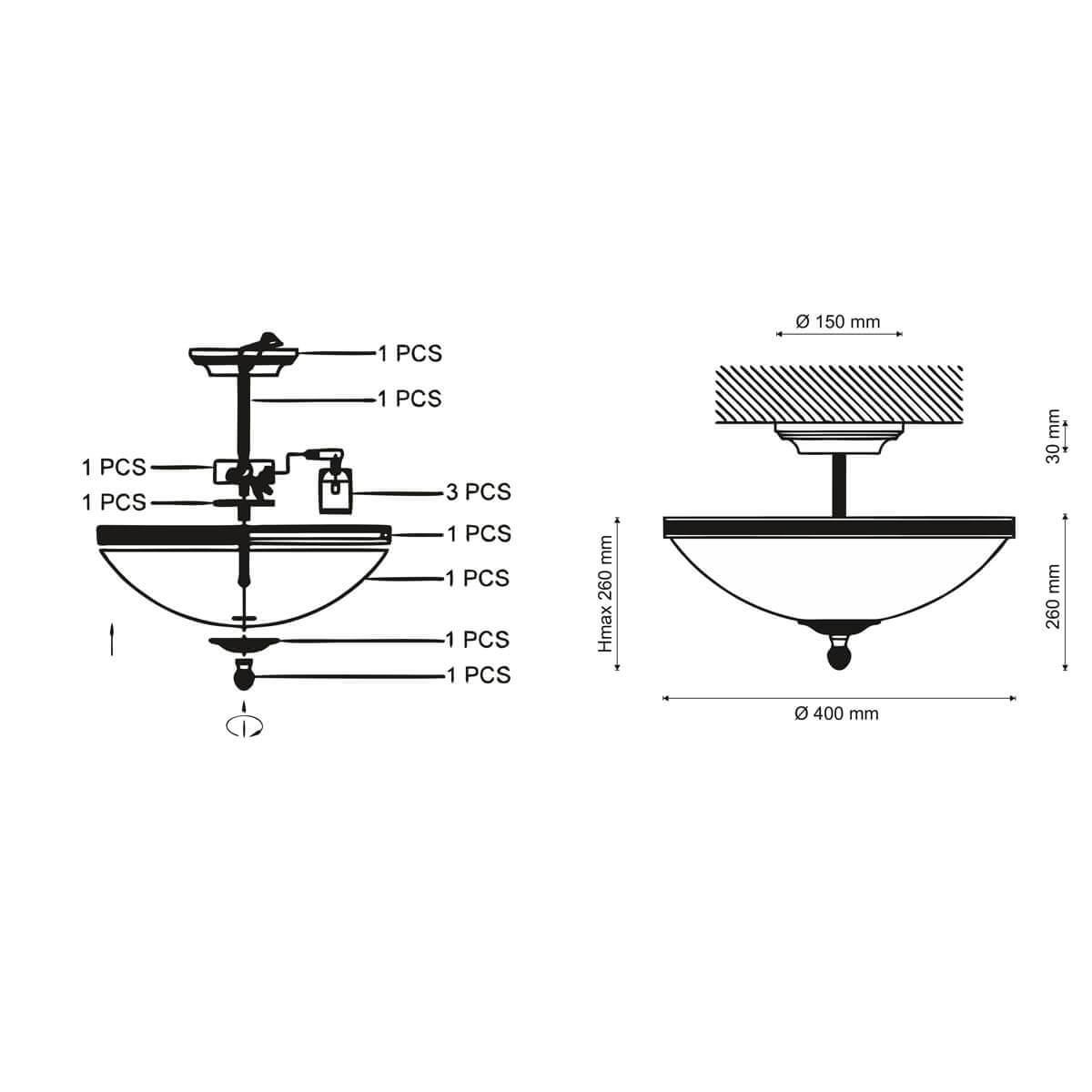 Для светильника необходима 3 лампы накаливания 60 W. Габариты изделия: высота – 240 мм, диаметр – 400 мм.
