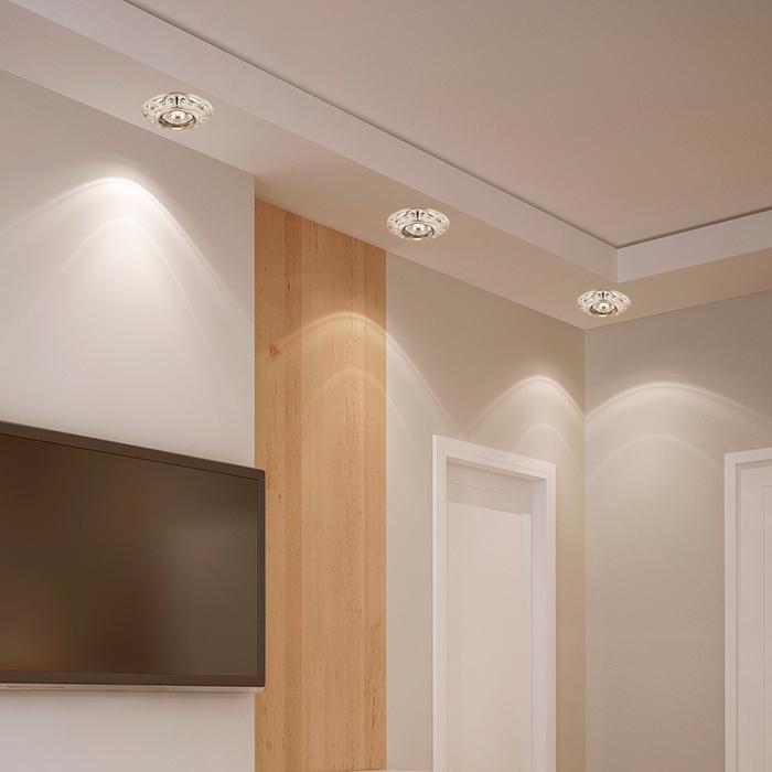 Для светильника необходима 1 галогеновая лампа 50 W. Габариты изделия: высота – 23 мм, диаметр – 105 мм.