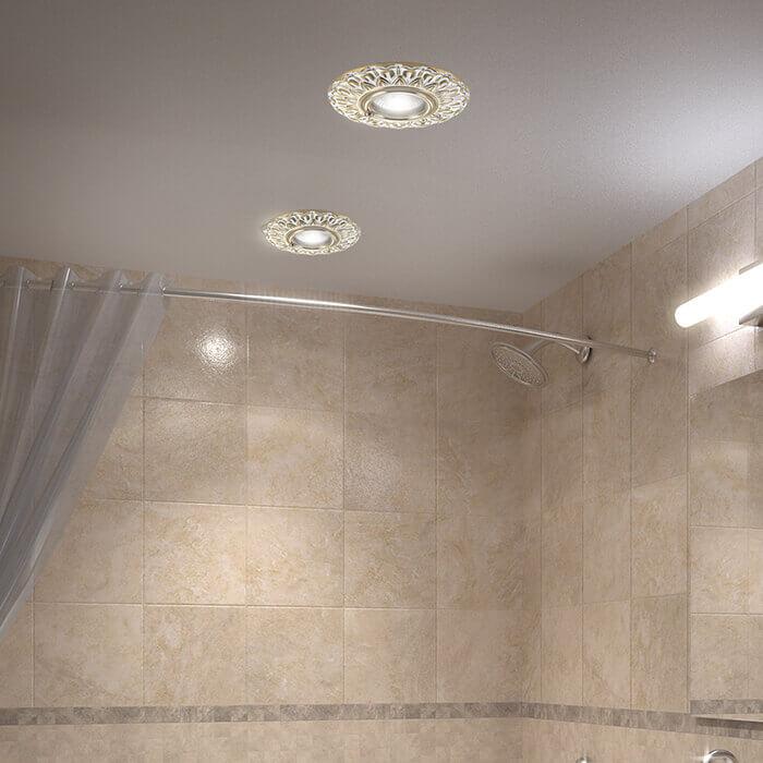 Встраиваемый светильник Novotech Spot Daisy 370051 от Венгерского бренда Novotech из коллекции Spot предназначен для установки на потолок в ванной в классиком стиле. Cветильник в форме круга с металлической арматурой залотого цвета и белого цвета плафонами из металла предназначен для освещения 2,8 м2.