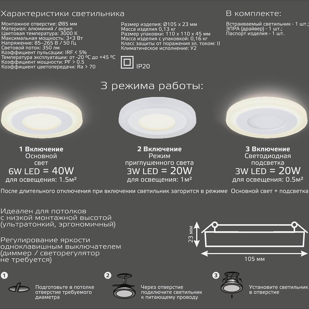 Для светильника необходима светодиодных ламп 3 W. Габариты изделия: высота – мм, диаметр – 105 мм.