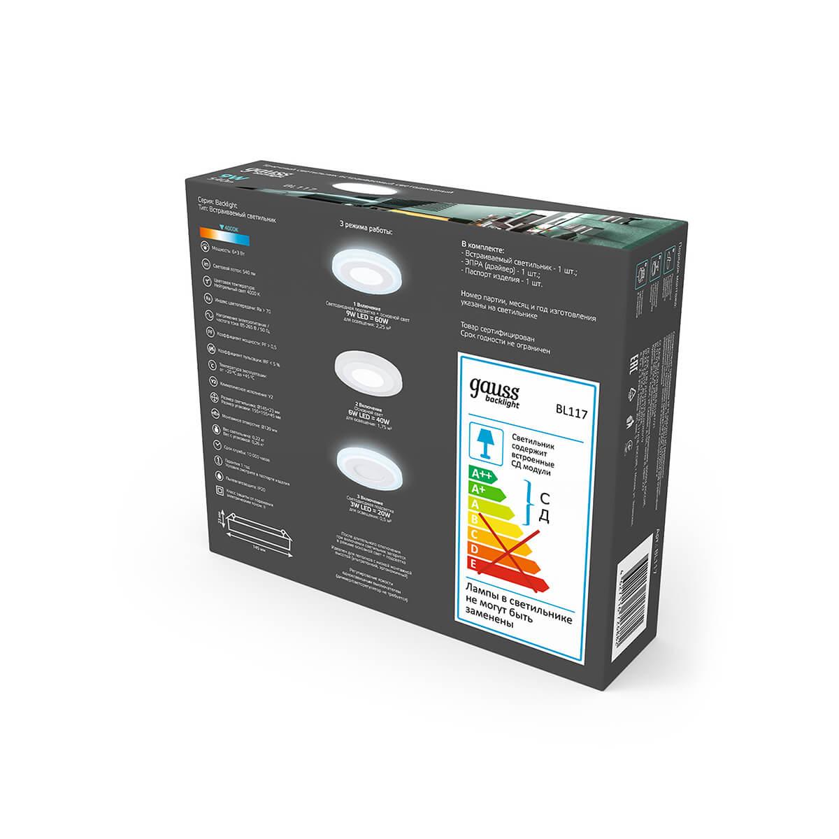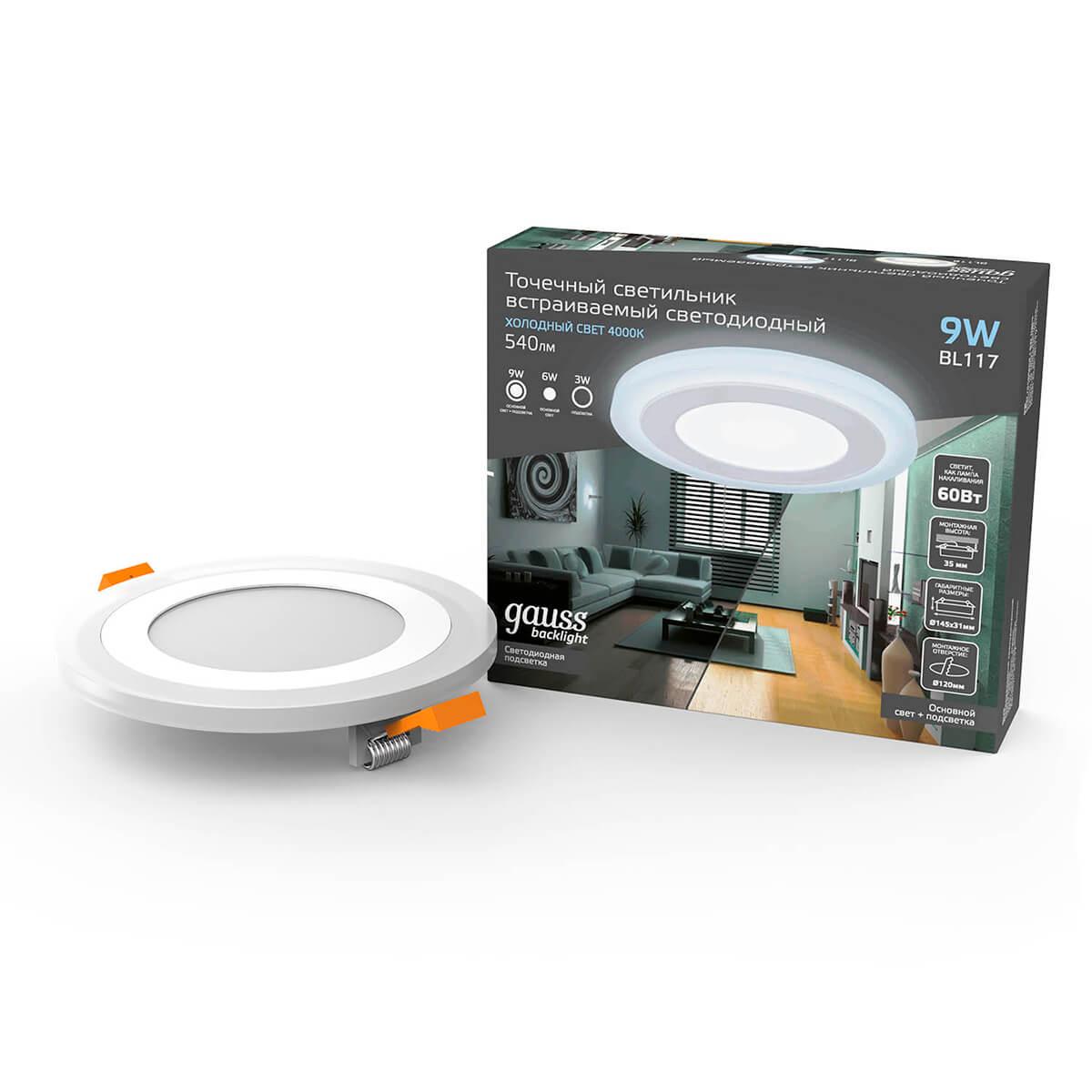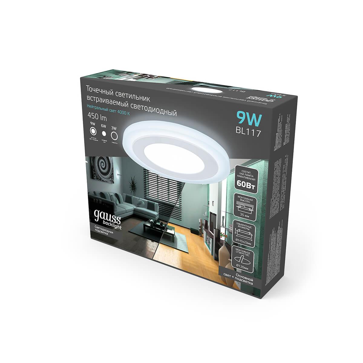Встраиваемый светодиодный светильник Gauss Backlight BL117 от Российского бренда Gauss из коллекции Backlight BL11 предназначен для установки врезания в гостиной в современном стиле. Cветильник в форме круга с пластиковой арматурой белого цвета и белого цвета плафонами из акрила предназначен для освещения м2.