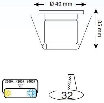Для светильника необходима светодиодных ламп 1 W. Габариты изделия: высота – 35 мм, диаметр – 40 мм.