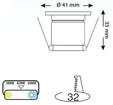 Для светильника необходима светодиодных ламп 1 W. Габариты изделия: высота – 35 мм, диаметр – 41 мм.