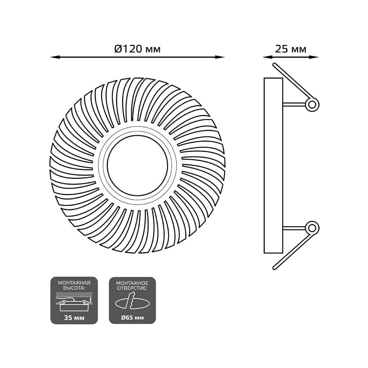 Для светильника необходима 1 светодиодная лампа 3 W. Габариты изделия: высота – 25 мм, диаметр – 120 мм.
