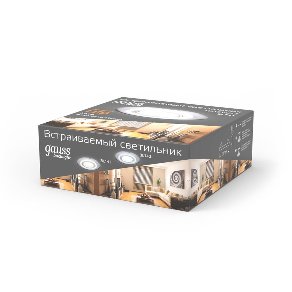 Встраиваемый светильник Gauss Backlight BL141 от Китайского бренда Gauss из коллекции Backlight предназначен для установки врезания в гостиной в современном стиле. Cветильник в форме круга с алюмииневой арматурой цвет хрома и прозрачного цвета плафонами из акрила предназначен для освещения 1 м2.
