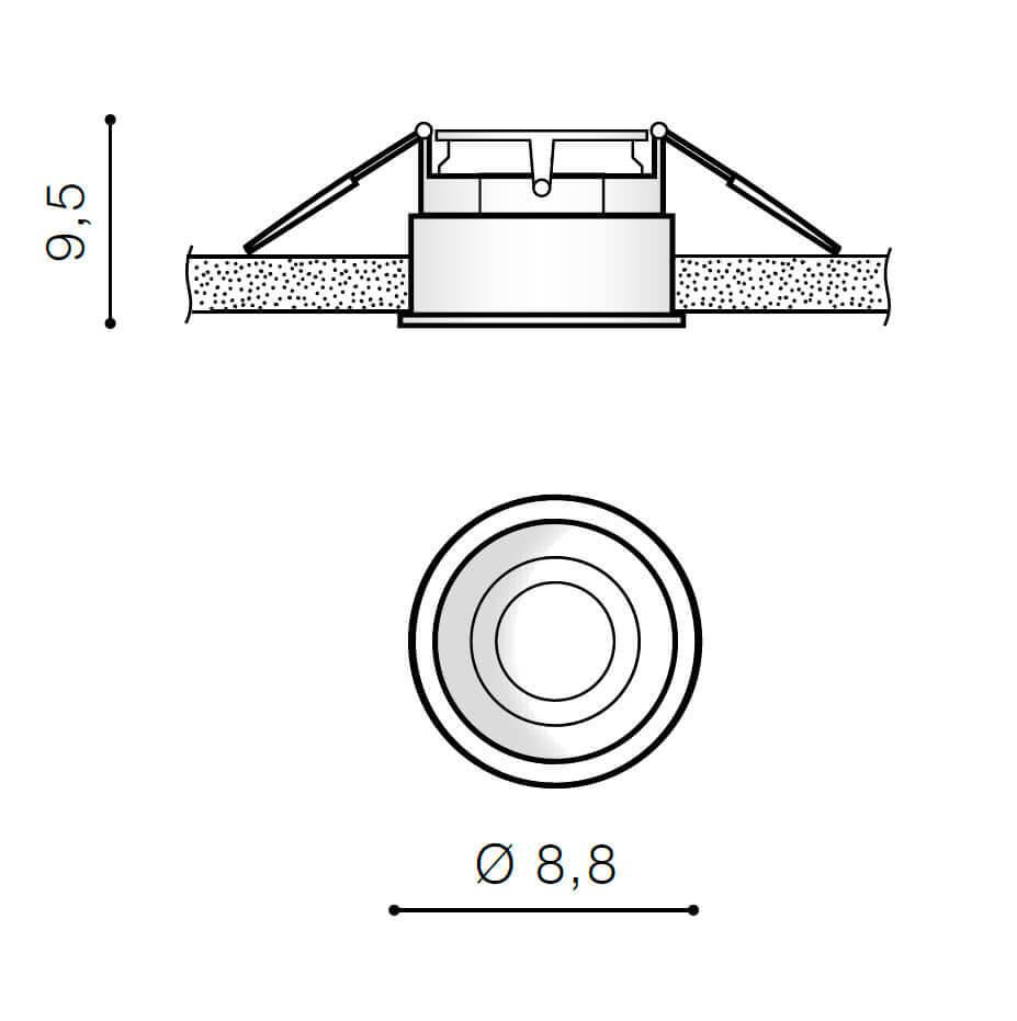 Для светильника необходима 1 галогеновая лампа 50 W. Габариты изделия: высота – 95 мм, диаметр – 88 мм.