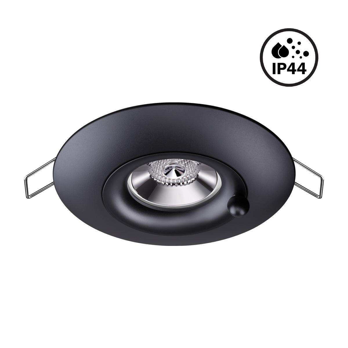 Встраиваемый светильник Novotech Spot Water 370792 от Венгерского бренда из коллекции Water предназначен для установки на потолок в ванной в современном стиле. Cветильник в форме с алюмииневой арматурой черного цвета и черного цвета плафонами из алюминия предназначен для освещения 2 м2.