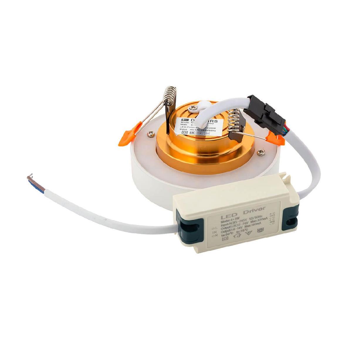 Встраиваемый светодиодный светильник Denkirs DK4006-GD от бренда Denkirs из коллекции DK4005 предназначен для установки врезания в гостиной в современном стиле. Cветильник в форме круга с алюмииневой арматурой белого цвета и залотого цвета плафонами из алюминия предназначен для освещения м2.