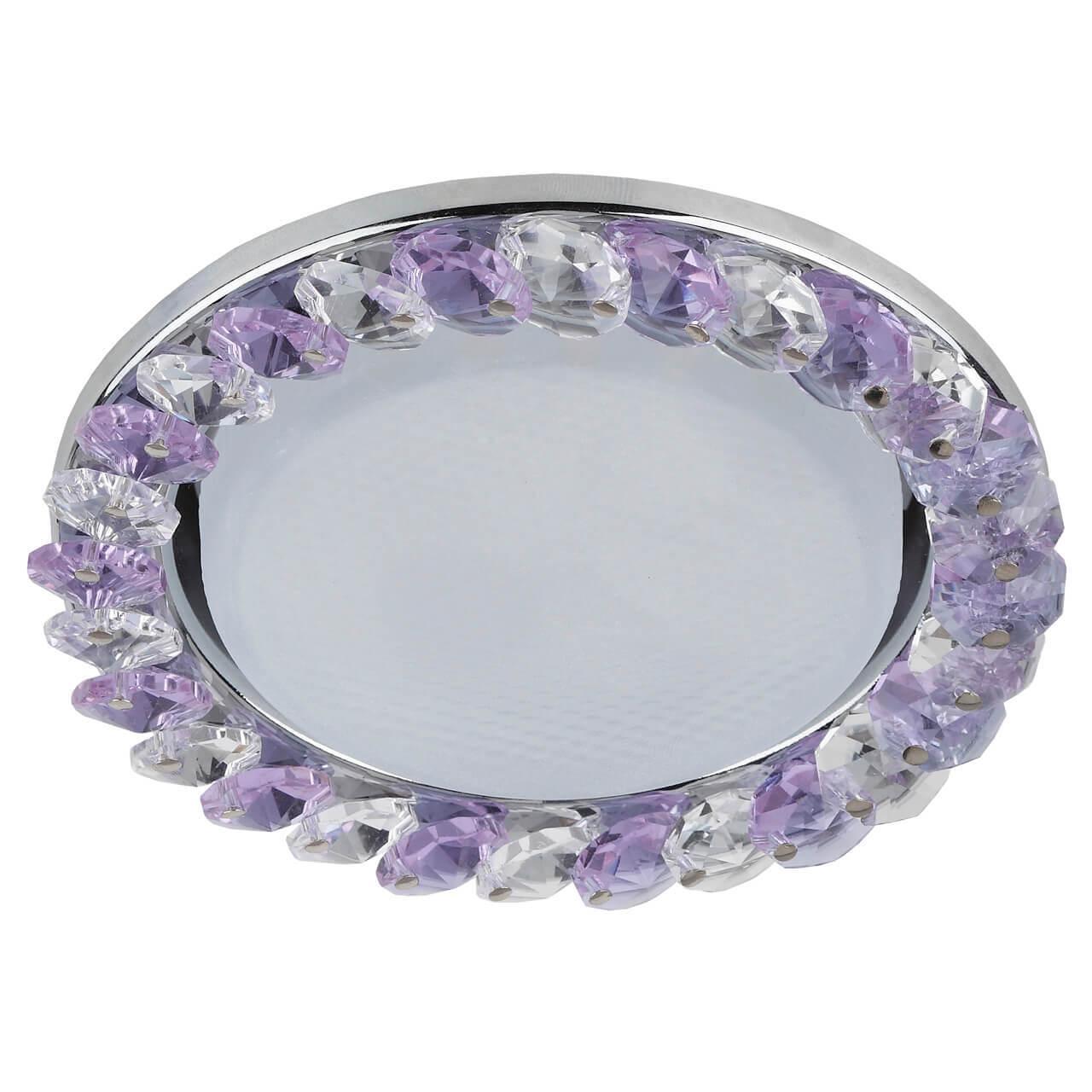 Встраиваемый светильник ЭРА GX53 DK85 CH/WH+PU Б0020574 от Российского бренда ЭРА из коллекции GX53 предназначен для установки в гостиной в стиле модерн. Cветильник в форме круга с металлической арматурой цвет хрома и фиолетового цвета плафонами из хрусталя предназначен для освещения м2.