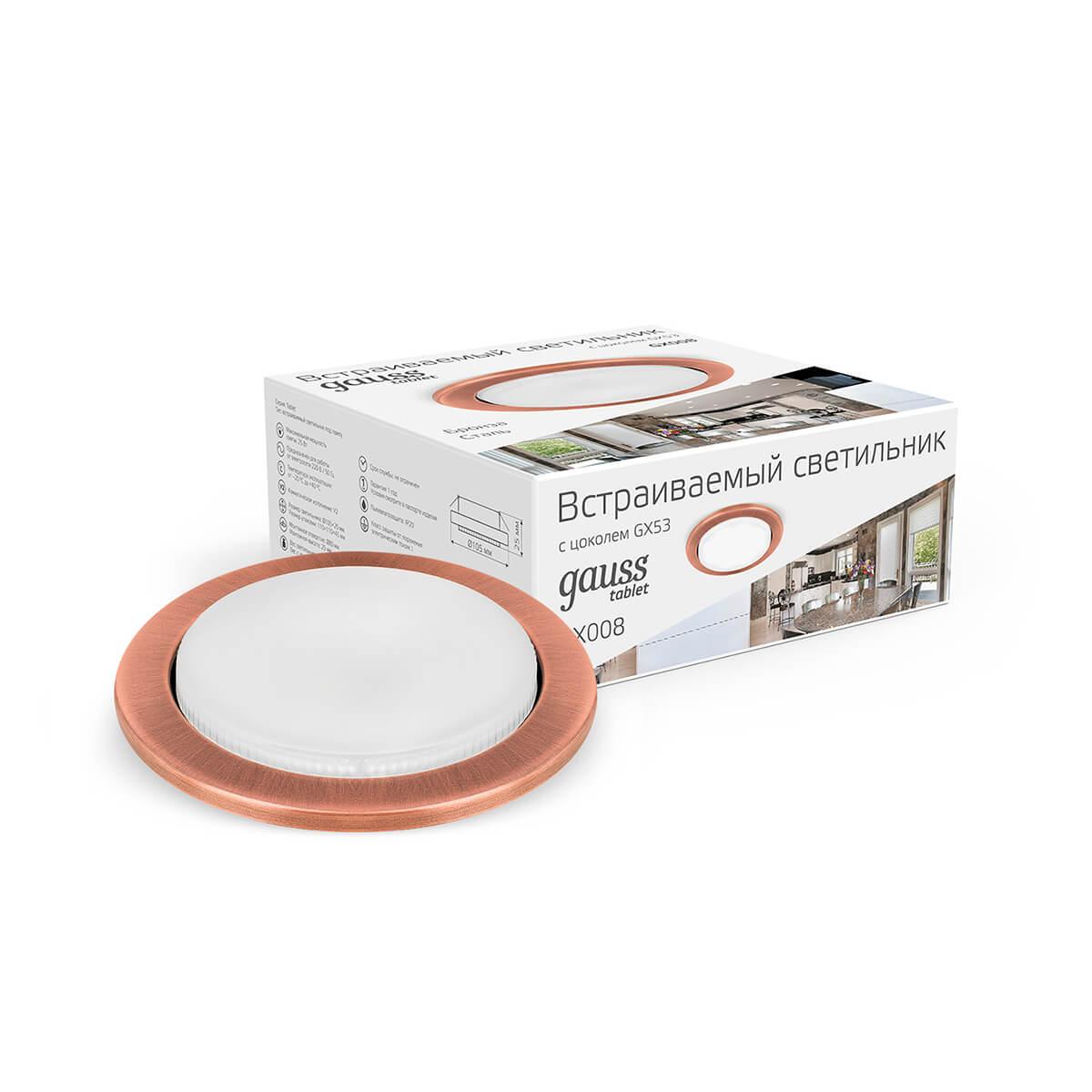 Встраиваемый светильник Gauss Tablet GX008 от Китайского бренда Gauss из коллекции Tablet предназначен для установки в кухне в современном стиле. Cветильник в форме круга с металлической арматурой бронзового цвета и бронзового цвета плафонами из металла предназначен для освещения 1,4 м2.