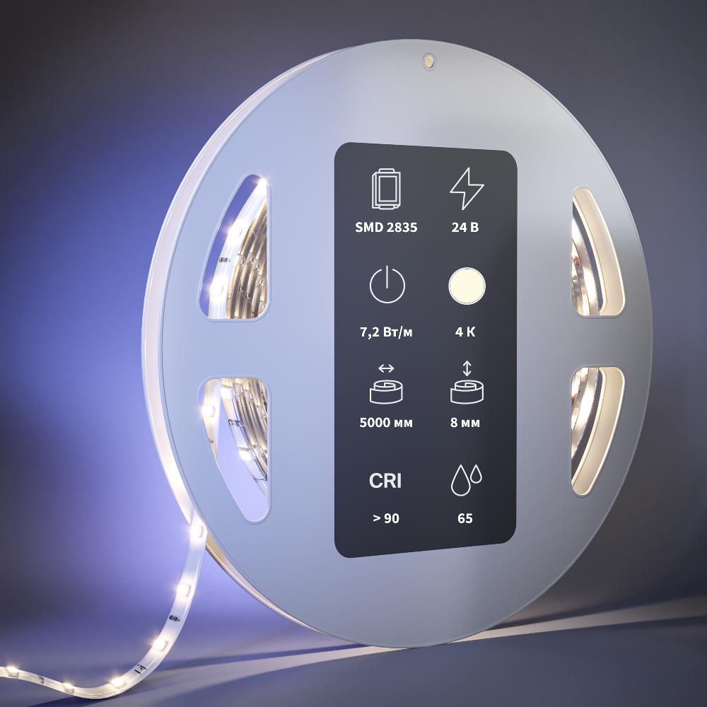 Цветовая температура ленты – 4000 К , мощность – 7,2 W, степень защиты – IP 65. Лента имеет минимальную длину 5000 мм.