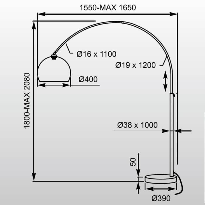 Для торшера необходима 1 лампа накаливания 60 W и цоколем E27. Лампы приобретаются отдельно. Габариты изделия: высота – 2080 мм, диаметр – 400 мм.
