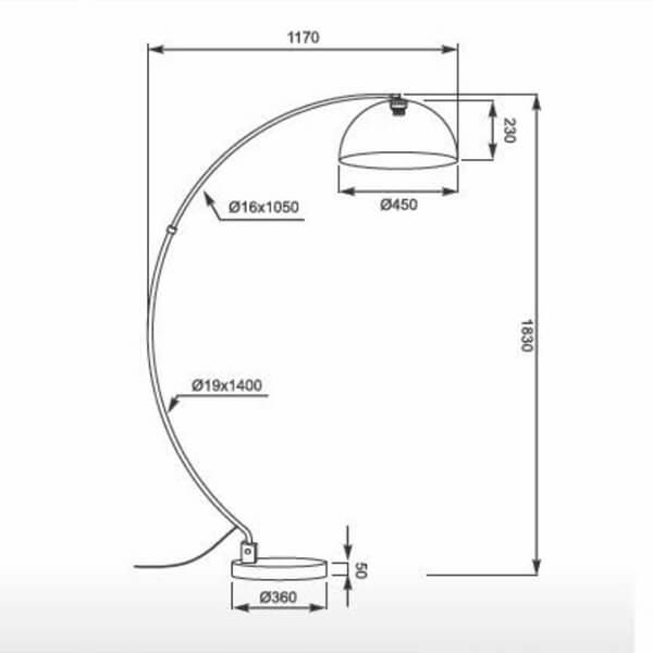 Для торшера необходима 1 лампа накаливания 60 W и цоколем E27. Лампы приобретаются отдельно. Габариты изделия: высота – 1830 мм, диаметр – 450 мм.